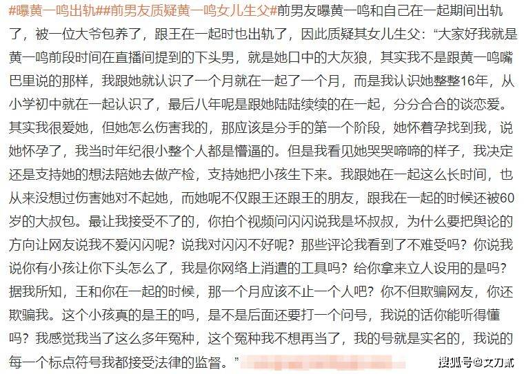 他告诉网友,最让自己无法忍受的,不是旧情已逝,不是付出打水漂,而是黄一鸣为了博眼球,毫无底线地把女儿拉进了这场成年人的混战里。