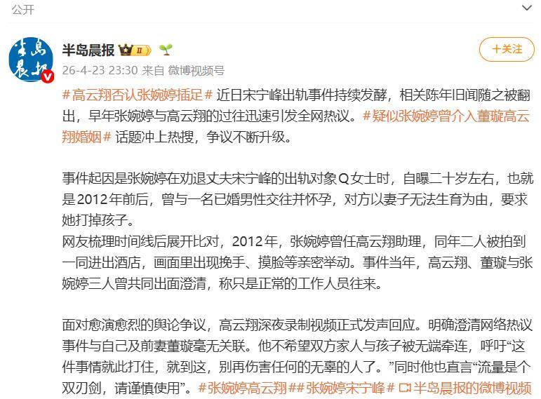 2012年,张婉婷正担任高云翔的助理,同年二人被拍到一同进出酒店,画面中出现了挽手、摸脸等亲密举动。当年,高云翔、董璇与张婉婷三人曾共同出面澄清,称只是正常的工作人员往来。但如今旧事重提,网友将“已婚男性”“打胎要求”“助理身份”“同框画面”等碎片拼凑在一起,舆论迅速发酵,“张婉婷曾插足高云翔婚姻”的话题阅读量飙升至数亿。