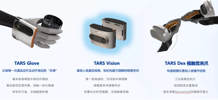 其中SenseHub套件包括TARS Glove(高精度动捕手套)和 TARS Vision(第一视角感知相机),轻巧易穿戴,主打随时随地采集数据。