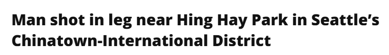 据4月23日报道,周四,西雅图中国城-国际区(CID)兴海公园(Hing Hay Park)附近发生枪击,一名37岁男子腿部中弹送医,嫌犯目前在逃。
