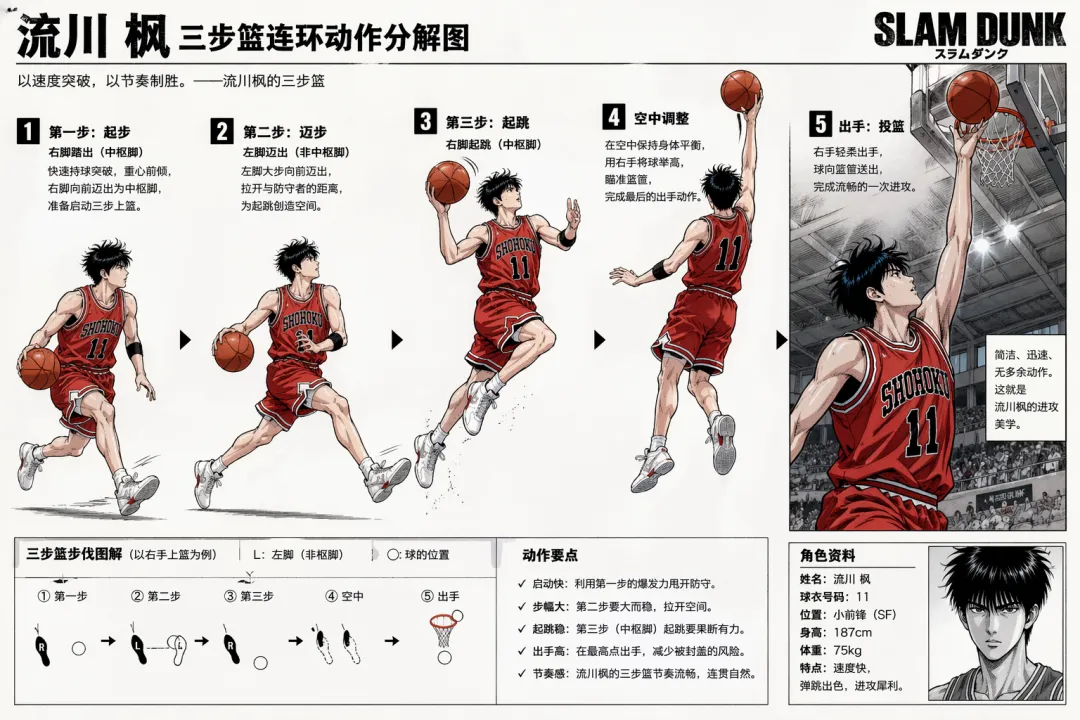 比如,我们已经可以在毫无上下文背景的情况下,让 Image 2 生成一张流川枫三步篮的动作拆解图。