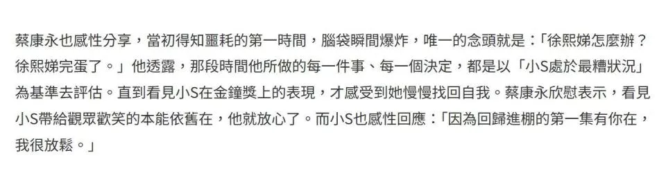 这次录《小姐不熙娣》,蔡康永也第一时间来撑她,并透露自己得知噩耗的第一时间,脑袋瞬间爆炸,唯一的念头就是“徐熙娣怎么办?徐熙娣完蛋了。”