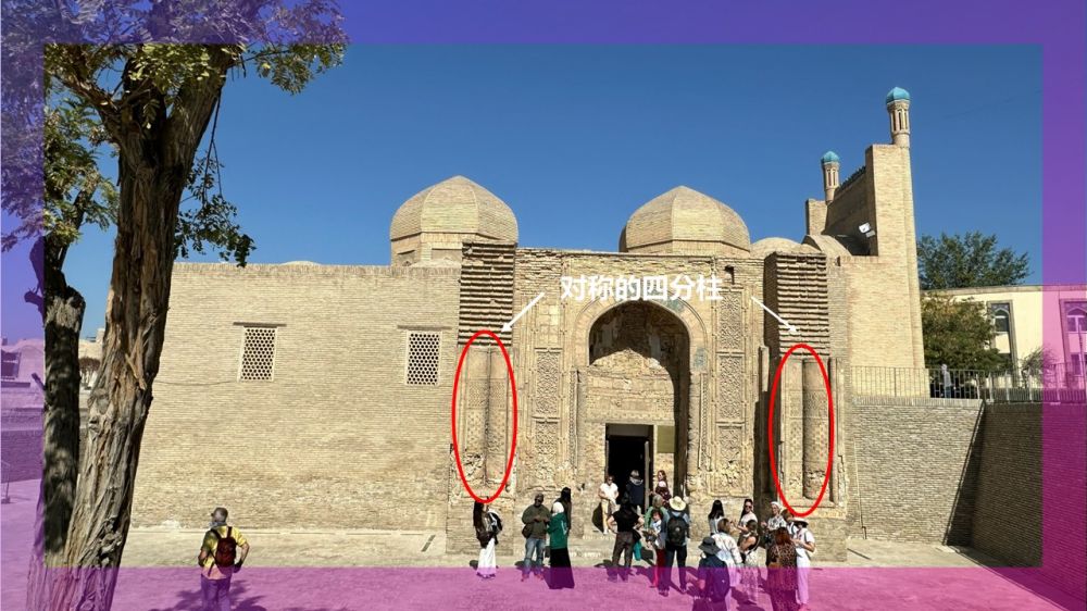 先介绍一下这座初建于8世纪的清真寺。它貌不惊人,却大有来头。除了贴有“中亚现存最古老清真寺”的标签外,还保留着7世纪伊斯兰化之前,祆教/拜火教流行年代的建筑遗迹。首先,它是坐落在祆教火神庙原址之上的;其次,它的入口两侧有两组成对的四分柱,这种建筑风格是前伊斯兰时代的回响;再有,用切割砖块组成的图案装饰正门,这也是典型的祆教特色。