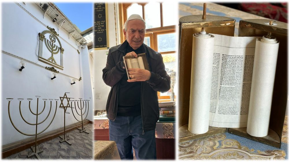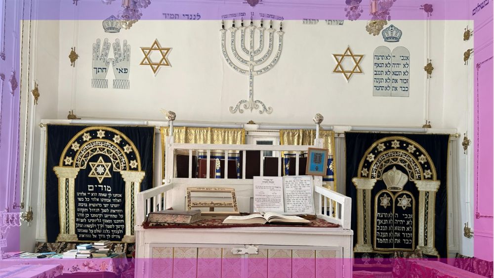 庭院右侧是一件不大的祈祷厅,我们进入时恰逢礼拜时间。一位不苟言笑的拉比手翻着托拉卷轴(Sefer Torah,上中/上右),神色严肃地以我们听不懂的语言诵读着《摩西五经》,靠窗而坐的几位信徒目不转睛地凝视着他。我们悄声入座,首次观摩犹太教仪式还是有些新鲜感-白+金的色系、犹太教的符号、历代拉比的相片、祈祷平台(bimah)和圣柜(ark)…这些犹太会堂的典型元素处处透着神秘的气息,唯有椅凳上覆盖着的色彩鲜艳的“苏扎尼”(Suzani)刺绣,才悄然地诉说着这样一个事实:这里终究是布哈拉的犹太会堂。