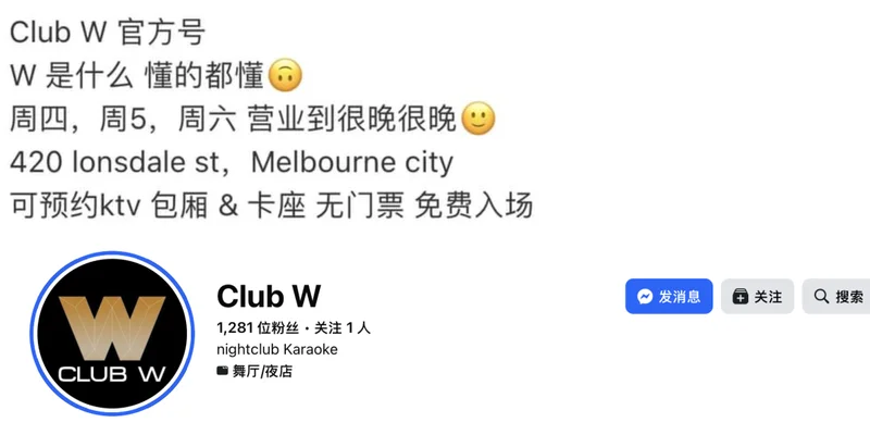 Club W墨尔本(Club W 2.0)是位于墨尔本市中心Lonsdale街的夜店,主打Hip-Hop、中文说唱、R&B、K-Pop和EDM。