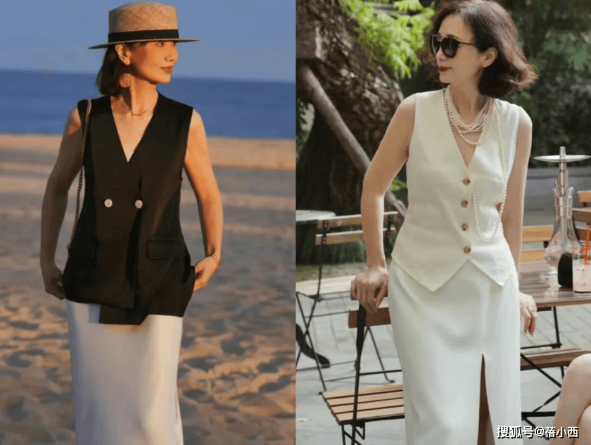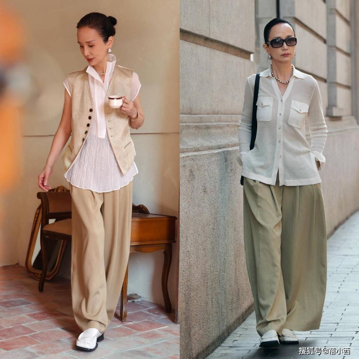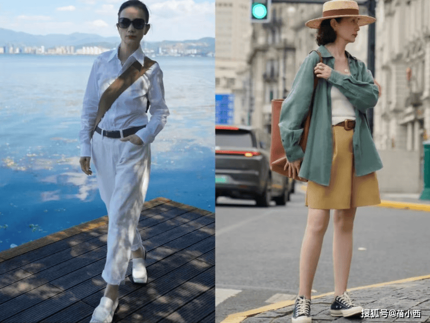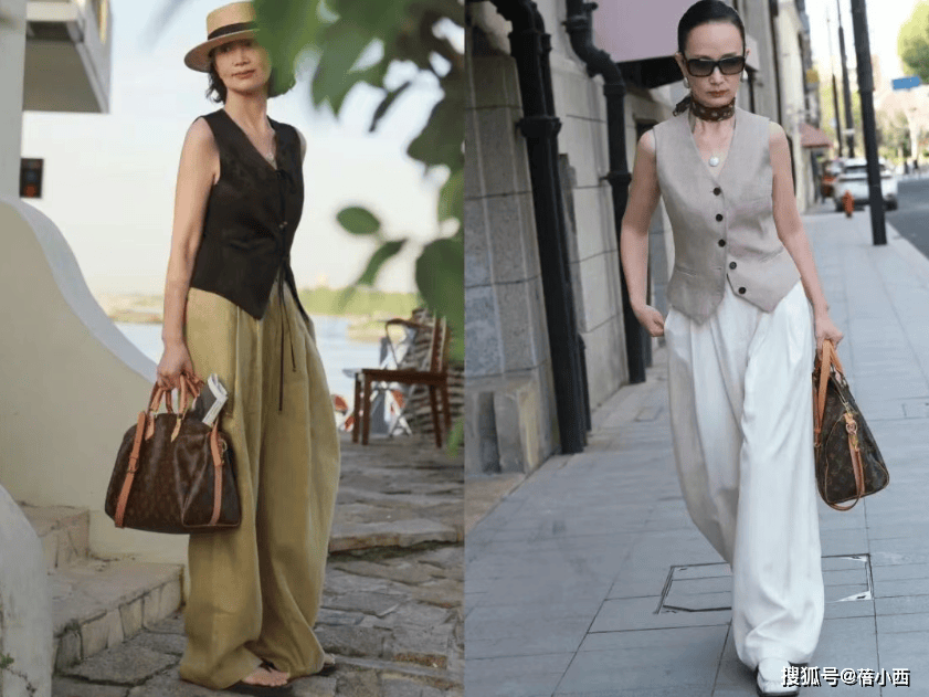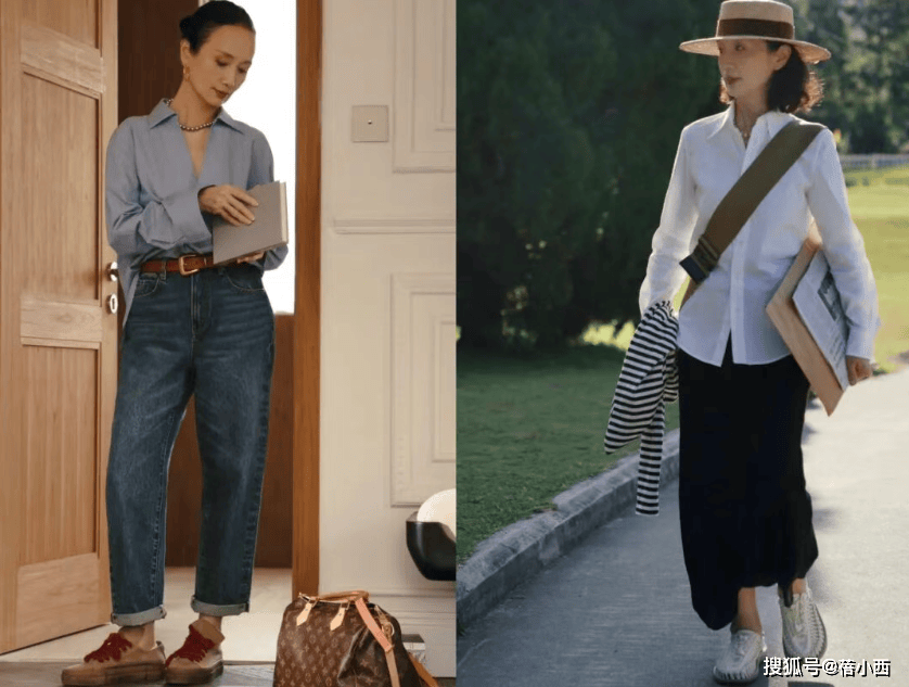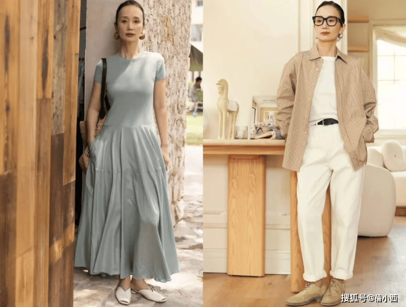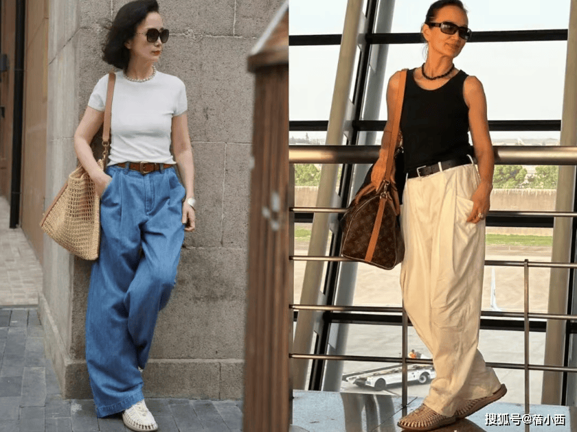 她很少穿大面积印花、亮片或高饱和色彩,避免了花哨带来的廉价感与杂乱感。即便是偶尔尝试亮色,也只作为小面积点缀,比如米白色衬衫搭配卡其色阔腿裤,视觉上显瘦又显挺拔,对中年女性格外友好,轻松穿出松弛显贵的气质。