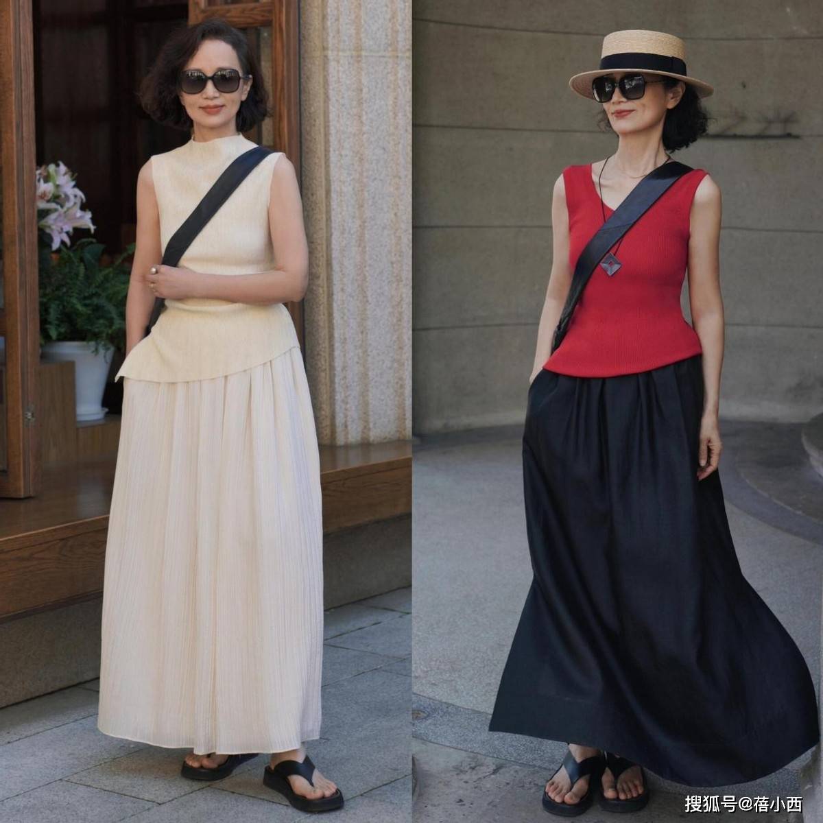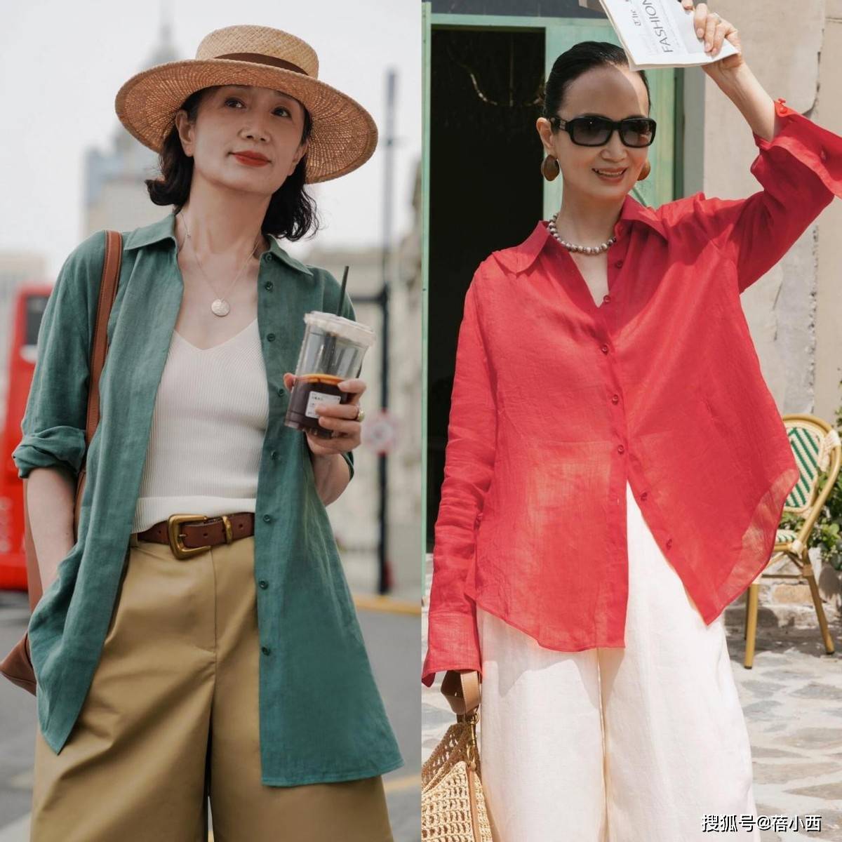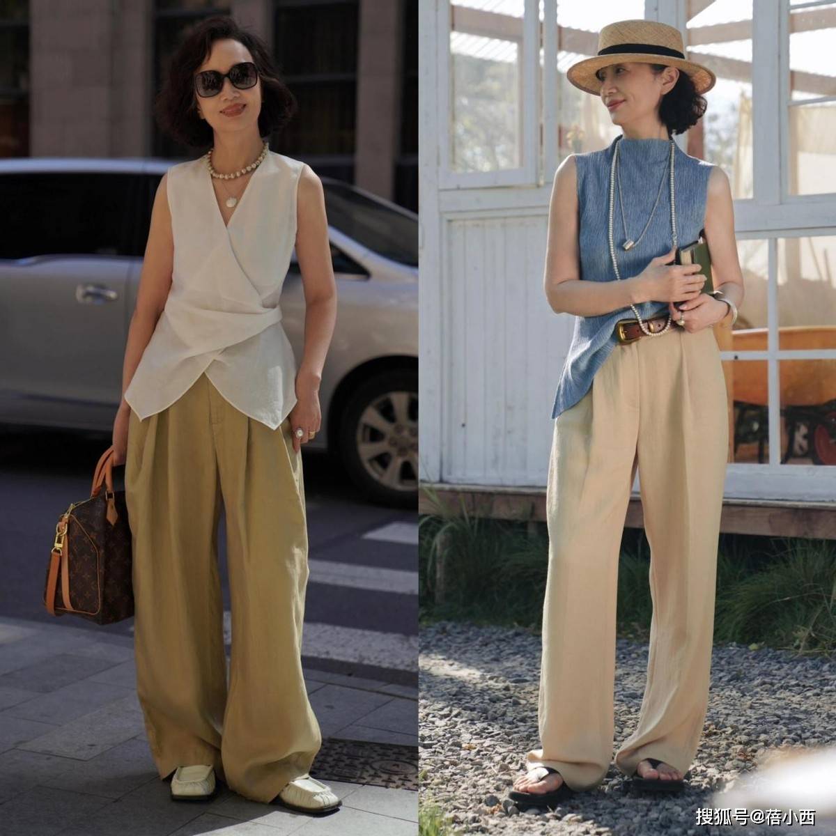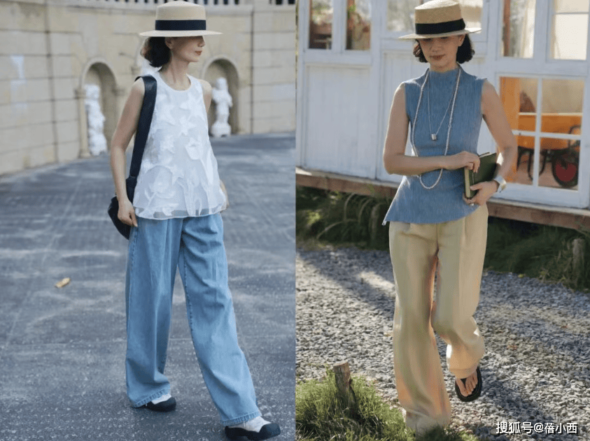 她很少穿大面积印花、亮片或高饱和色彩,避免了花哨带来的廉价感与杂乱感。即便是偶尔尝试亮色,也只作为小面积点缀,比如米白色衬衫搭配卡其色阔腿裤,视觉上显瘦又显挺拔,对中年女性格外友好,轻松穿出松弛显贵的气质。