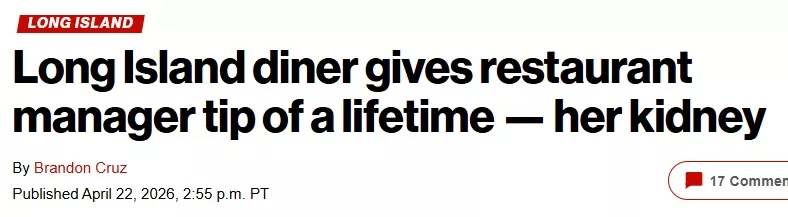 Long Island diner gives restaurant manager tip of a lifetime - her kidney https://t.co/EjqVCFiWpX pic.twitter.com/hnW3JNezYf