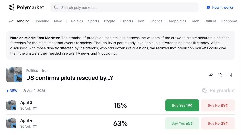 2026年4月3日,一架美军F-15战机遭伊朗击落,2名机师弹射逃生,有1名已被寻回,另外1名则下落不明。美国热门预测市场平台Polymarket 同日允许用户就该名失踪机师何时获救接受用户下注,事件引发民主党众议员狠批,Polymarket其后迅速将赌盘下架。(X@sethmoulton)