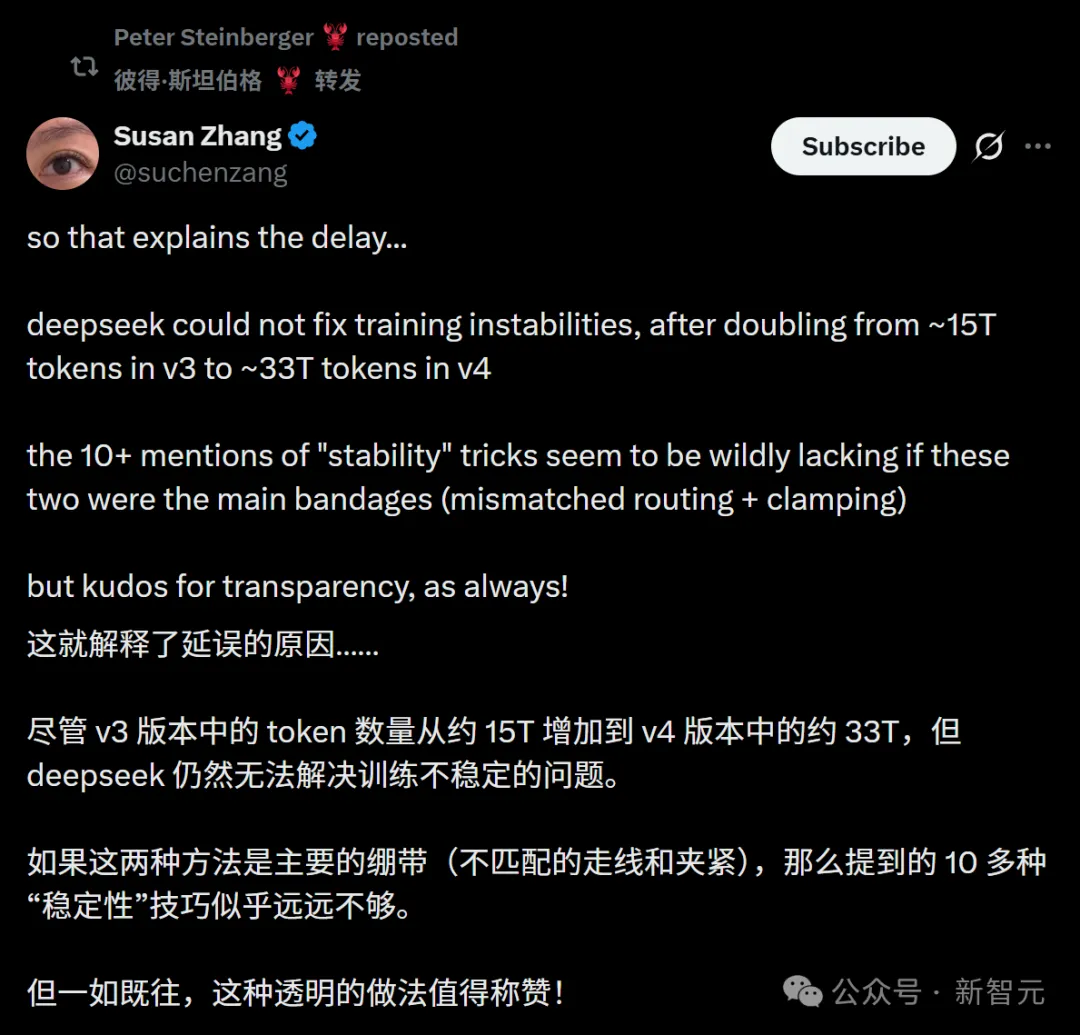 DeepSeek-V4的技术报告,简直诚实得令人震惊。V4发布延迟的秘密,被正式透露了!这颗大雷的背后,究竟是指谁?研究者们已经纷纷展开了猜测。并且,论文中用硬核工程暴力重构Agent的操作,也让社区直呼:国产之光,实至名归。