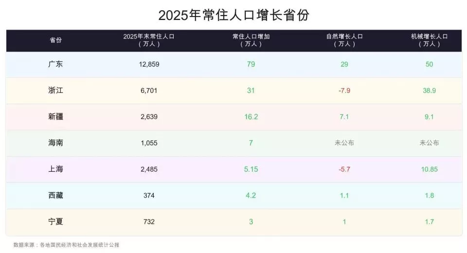 数据显示,区域间的人口变动分化明显。广东、浙江、新疆、海南、上海、西藏、宁夏7个省份在2025年实现了常住人口的同比增长;山东、河南、四川等多个传统人口大省则出现同比下降。而经济强省江苏也出现了多年来的首次常住人口负增长。
