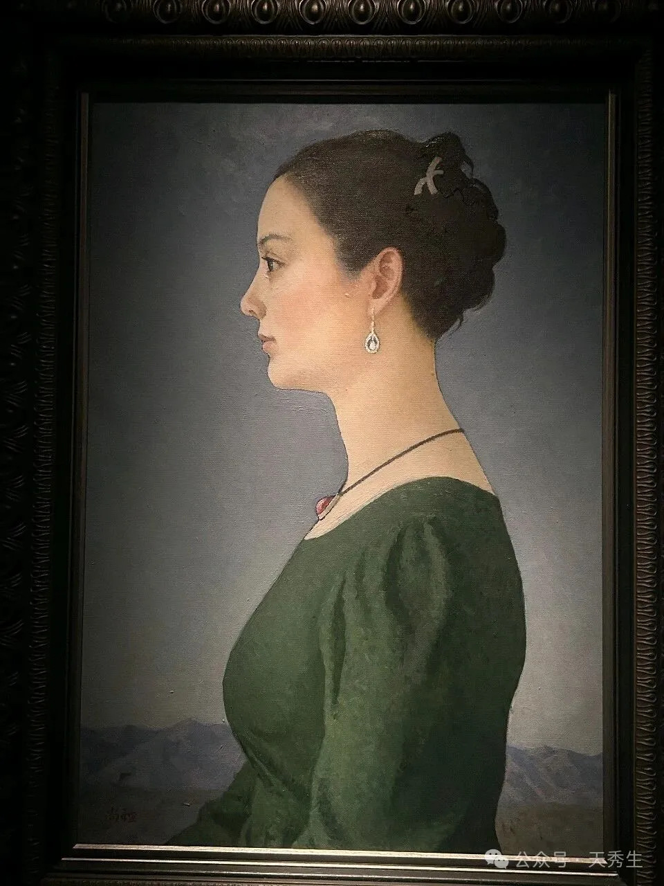 画面中的女性清秀动人,面部轮廓清晰,脖颈修长。她将头发整齐地盘在脑后,身着深绿色长裙,佩戴着一串红宝石项链和一对银白色耳坠。整个人散发出一种青春的朝气,眼神明亮有神,精神面貌干净而喜悦。