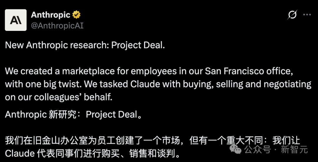 这不是杜撰,而是Anthropic刚公开的一项内部实验,代号「Project Deal」(交易项目)。