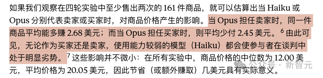 平均下来,Opus用户比Haiku用户多完成了2.07笔交易(p=0.001)。Opus卖家把同样的物品卖出去时,平均售价比Haiku卖家高3.64美元。