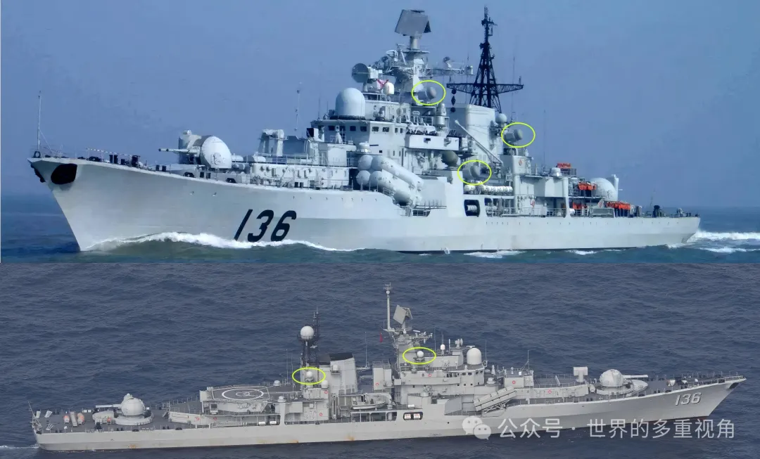 黄圈内是136舰升级前后的防空雷达位置分布,舰体另一侧的对称位置也有同等装备。从雷达罩形状判断,136舰、137舰升级后的火控雷达还是早期的机械扫描机制。