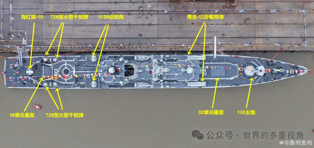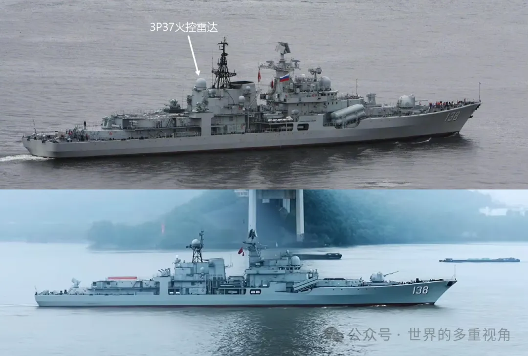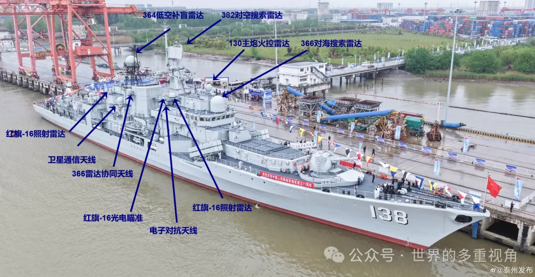 昨天解析升级后的138泰州舰,缺少全局高清照片,看得不过瘾。 今天,《泰州发布》发布了该舰的高清大图。 上图是武器分布,火力强度高于054A。 上图是主要电子设备分布,基本上就是移植了054A后期型号的子系统。 另外,138舰升级后,取消了机库上的3P37火控雷达。 因为该雷达是用来制导“卡什坦”近防系统里的9M311(SA-N-11)导弹的,而138舰升级后已经用1130替换了“卡什坦”。
