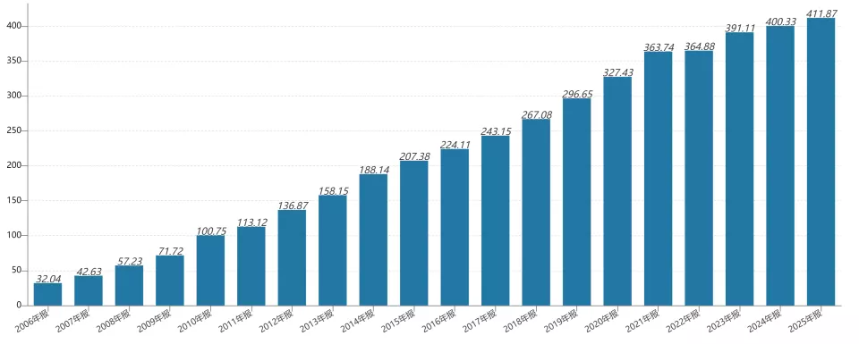 云南白药近20年的营收情况(亿元)。数据来源:公司财报,Wind