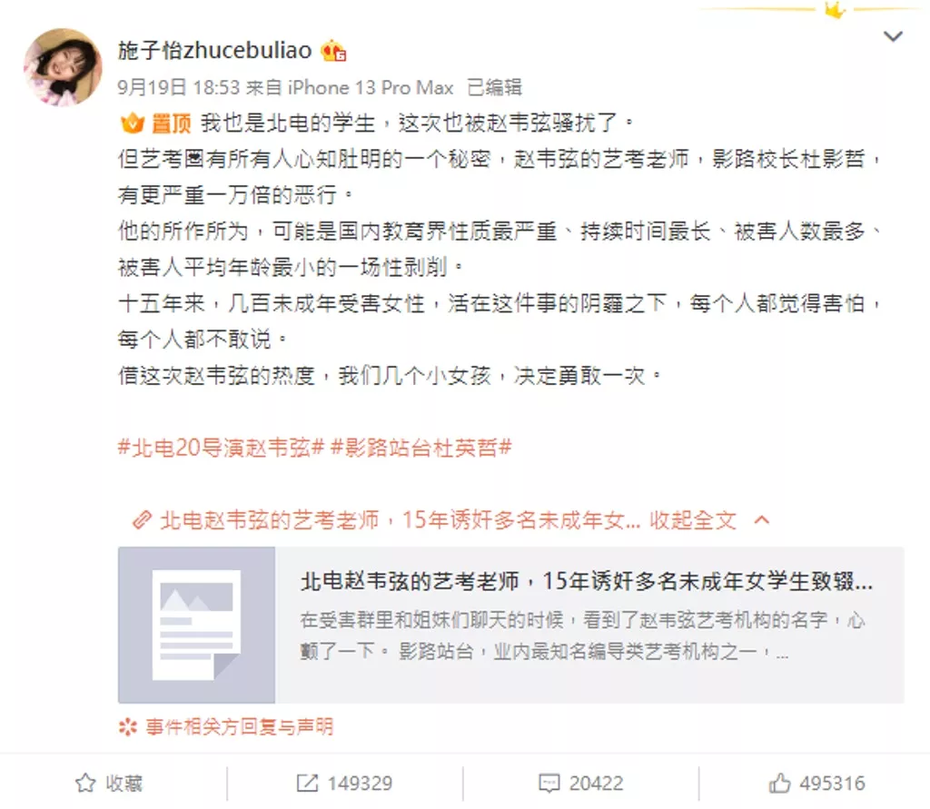 早前,内地知名艺考机构“影路站台”男教师杜英哲被指控存在强奸和强制猥亵,北电学生、网红施子怡及其他20多名被骚扰、侵犯私隐的受害者联合发声,在网上引起热议,该案因此也被称为“艺考圈房思琪案”。