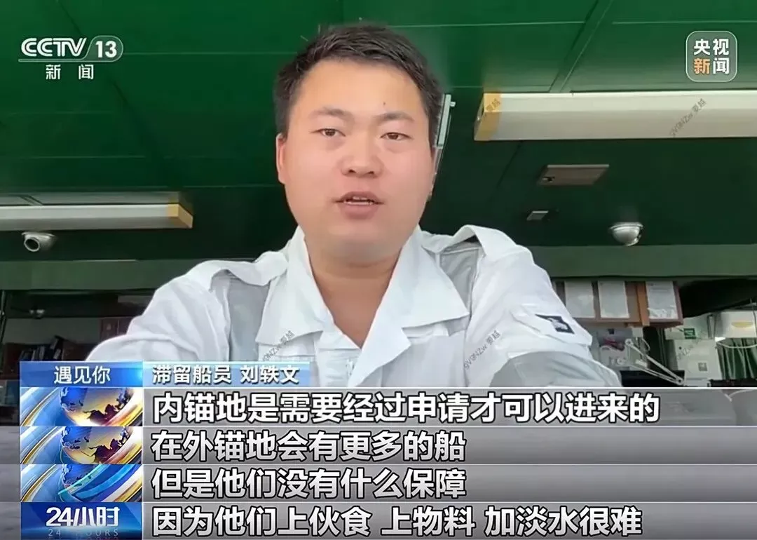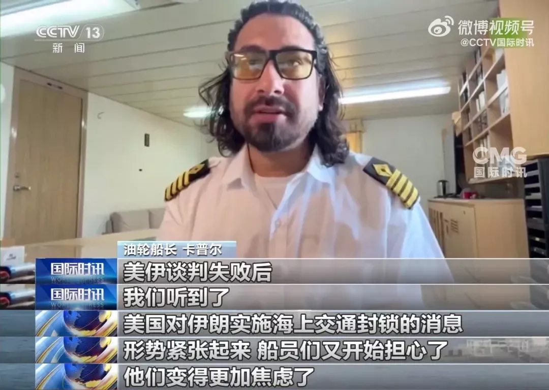 媒体披露,有中国大陆船员被困在波斯湾已长达53天,濒临“精神崩溃”。图为一名受困船员。(央视新闻)
