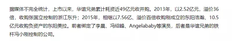 比如溢价36倍,用2.52亿元收购张国立的浙江东升;溢价75倍,以7.56亿收购李晨、冯绍峰等人的东阳浩瀚;溢价百倍,以10.5亿元收购冯小刚的东阳美拉。