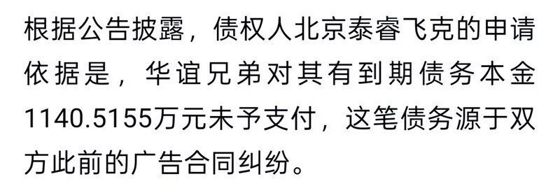 据公告披露,因未按期偿还这笔债务本金,身为债权方的北京泰睿飞克以“不能清偿到期债务且明显缺乏清偿能力,但具备重整价值”为由,向浙江省金华中院申请对华谊兄弟进行重整及预重整。