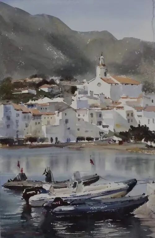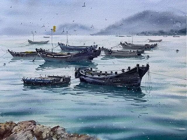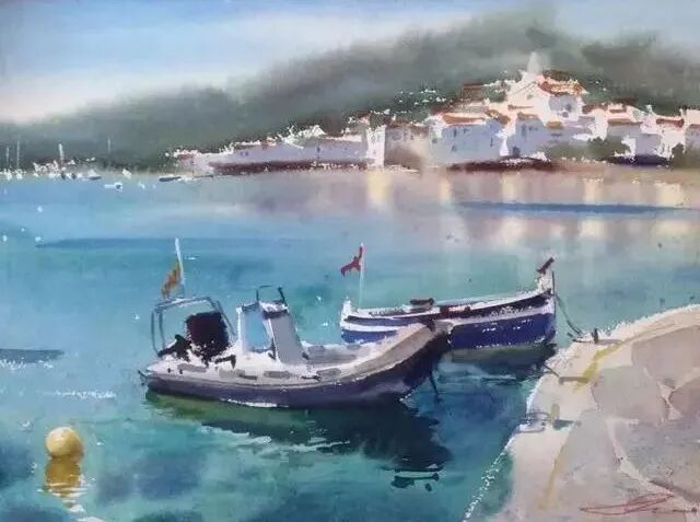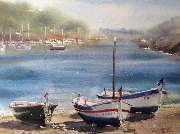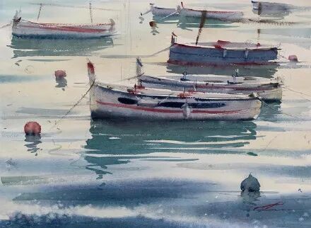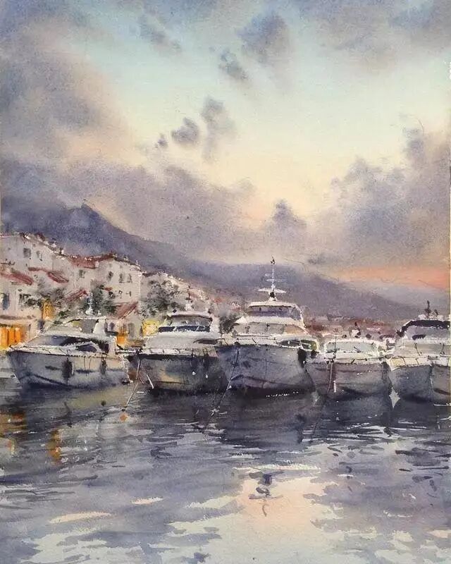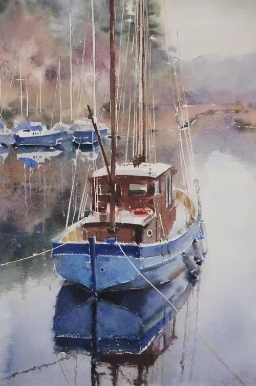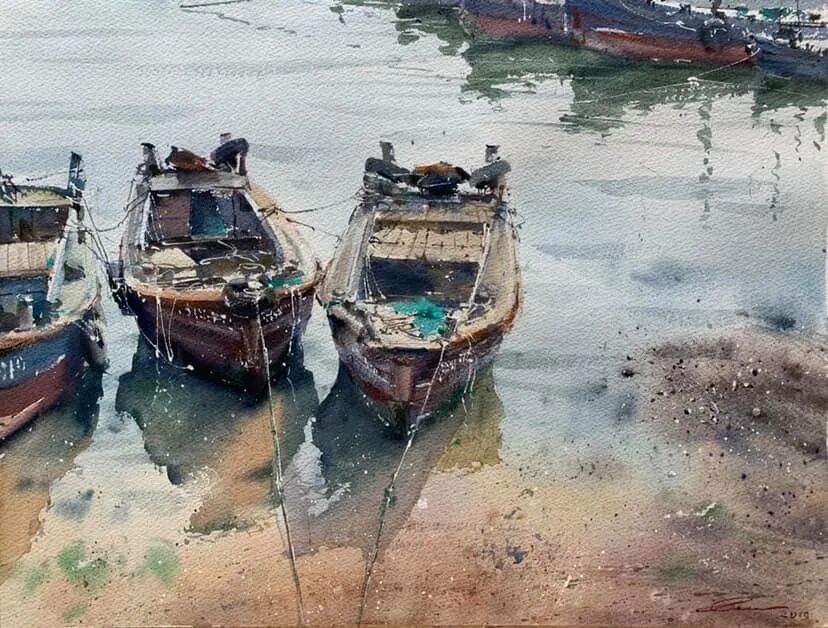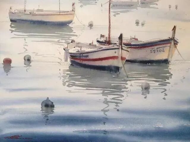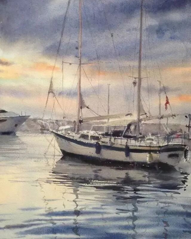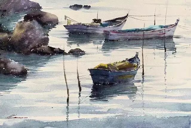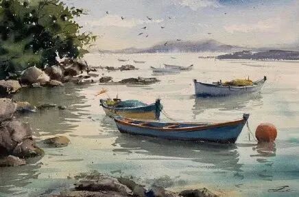 整体画面风格比较松动,画面中对虚实的笔触控制特别清晰,对干湿画法的处理非常细腻。大多数背景,远景的植物,建筑,乃至水波纹都会用湿画去虚化处理,在船体本身和倒影这种重点部分采用的是干画比较实的刻画。