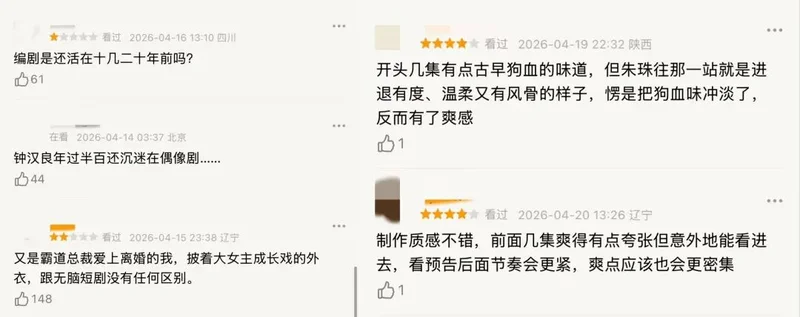 观众一边吐槽2026年了怎么还在拍霸道总裁,长剧硬是拍出了短剧感;另一边却又忍不住磕“熟龄CP”,结婚纪念日捉奸、酒局怒怼小三、离婚净身出户,一集3个高潮,短剧般密集的爽感让人上头。