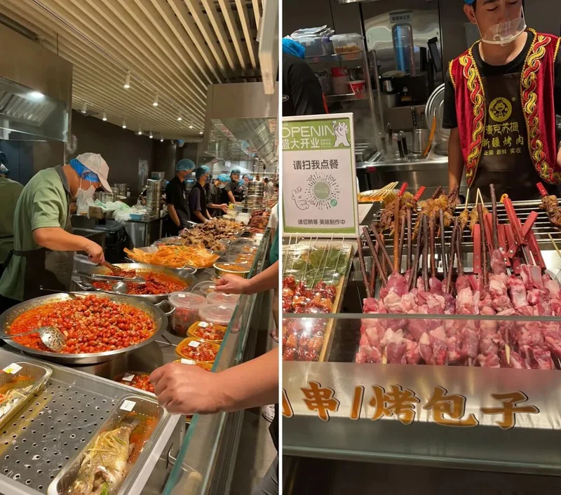 在鲜风生活的小吃一条街里,商家直接把一整头羊挂在档口里,羊肉串现切现烤,新鲜看得见;在潮汕牛肉粿条的档口里,牛肉现切、骨头现熬、粿条现蒸,还能免费续汤免费续粉;在小炒档口里,服务员就在你的面前开炒,主打的就是一个新鲜现炒不预制……