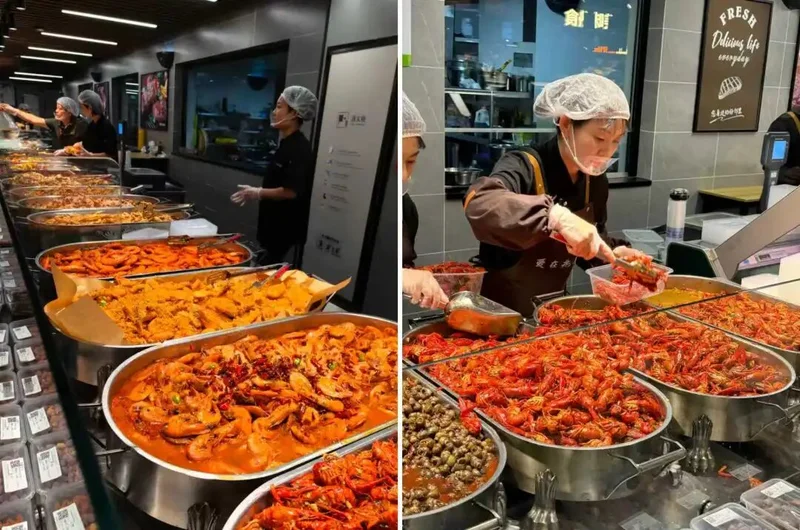 2)餐饮品类丰富。如今 “三岛一街”(即热卤&凉菜岛,热食&炸烤岛,面食&汤粥岛,外加小吃一条街)已经成为“餐超”的标配,另外随着超市竞争的加剧,在品类的差异化上,“餐超”还在不断加码:雅斯食堂推出了类似大米先生的“小碗菜;’567’鲜生的海鲜不但现捞现卖,还提供免费加工;“商超天花板”胖东来更是隐藏的“餐饮大佬”,开出的餐厅包括烘焙店、麻辣香锅、铁板烧、湘菜馆、麻辣烫和面馆。