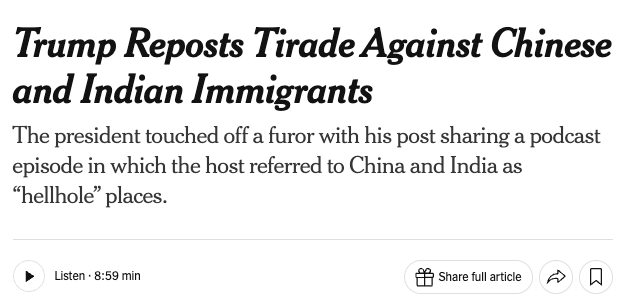 与此同时,亚裔美国人权益组织及部分民主党议员亦对川普转发相关内容表示不满,认为在政府推进收紧合法移民政策的背景下,此类言论进一步加剧印度裔和华裔美国人对自身社会地位的担忧。