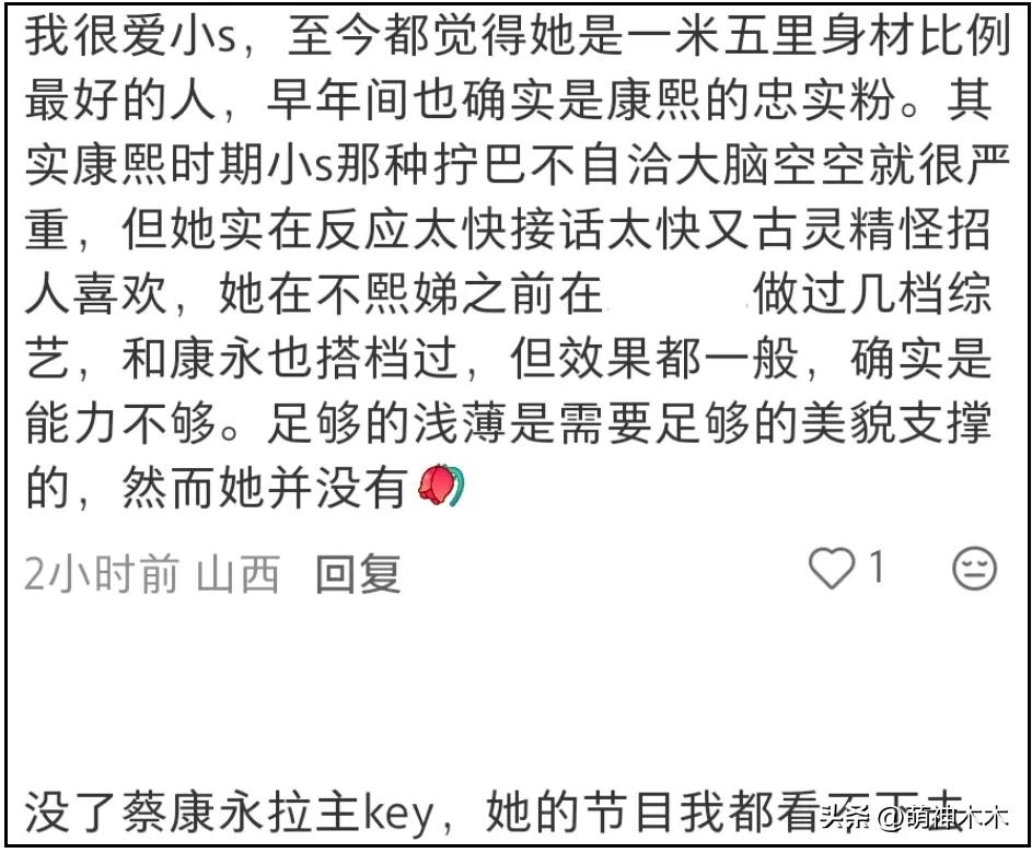 发文的业内是一名脱口秀演员,对小S并没有恶意,更多是感慨她的状态变化,希望小S尽快转型,从业内给网友回复看,他应该能联系到小S节目制作人,不知道会不会把其他网友的意见反馈给小S呢?