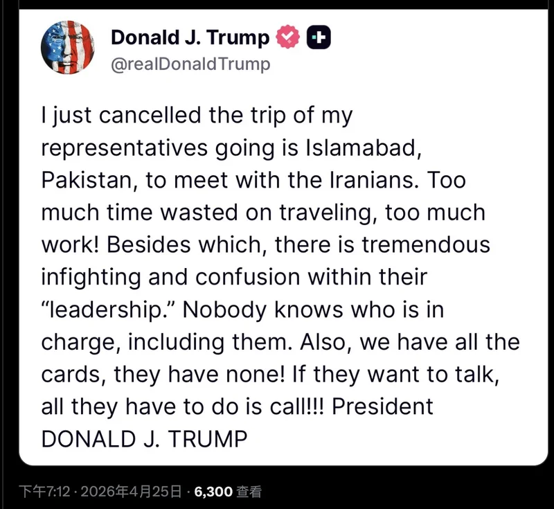 据央视新闻报道,美国方面25日消息,美国总统特朗普当天称,已取消总统特使威特科夫和女婿库什纳前往巴基斯坦与伊朗谈判的行程。
