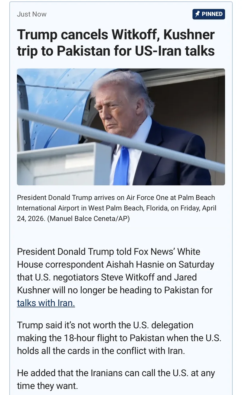 报道的原标题是《Trump cancels Witkoff, Kushner trip to Pakistan for US-Iran talks》(特朗普取消了威特科夫和库什纳前往巴基斯坦进行美伊会谈)。