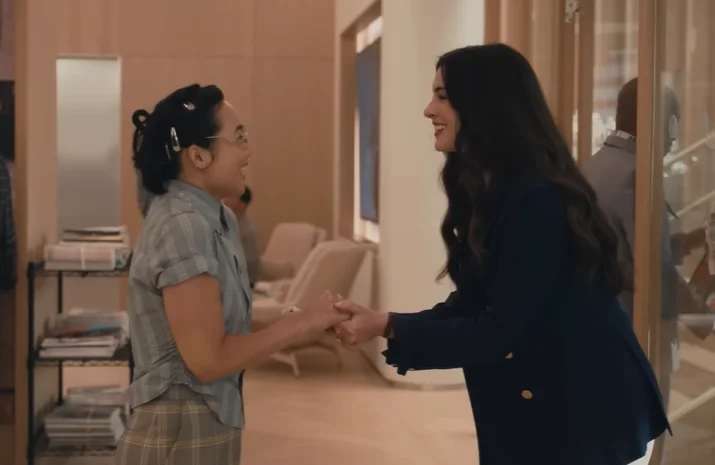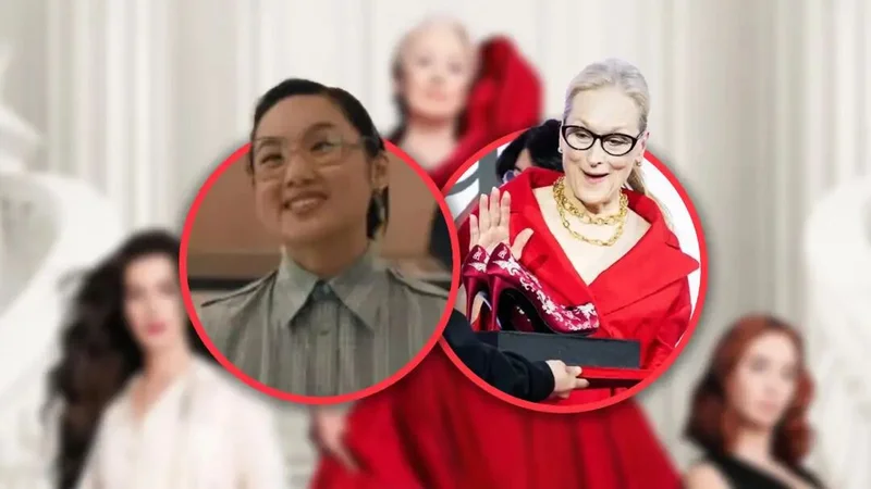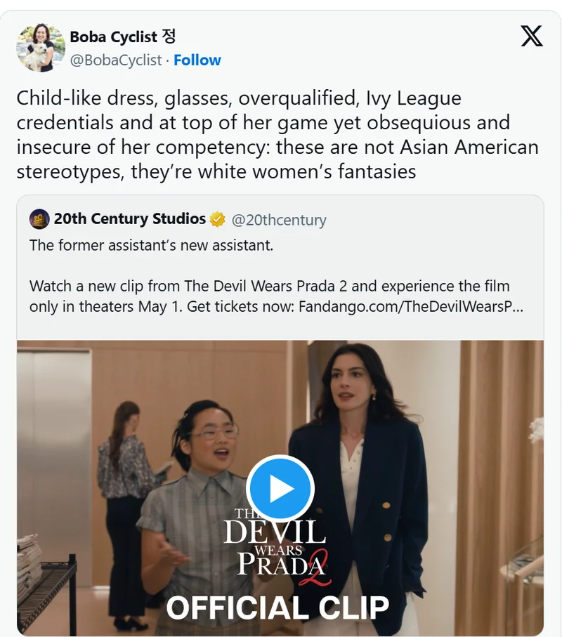 在电影片段里,这位华裔助手出场时穿着一件扣得严严实实的条纹衬衫,搭配着一条格子裙,戴着厚重的黑框眼镜。在一家全球顶尖、讲究极致审美的时尚杂志社里,这种装扮显得格格不入。
