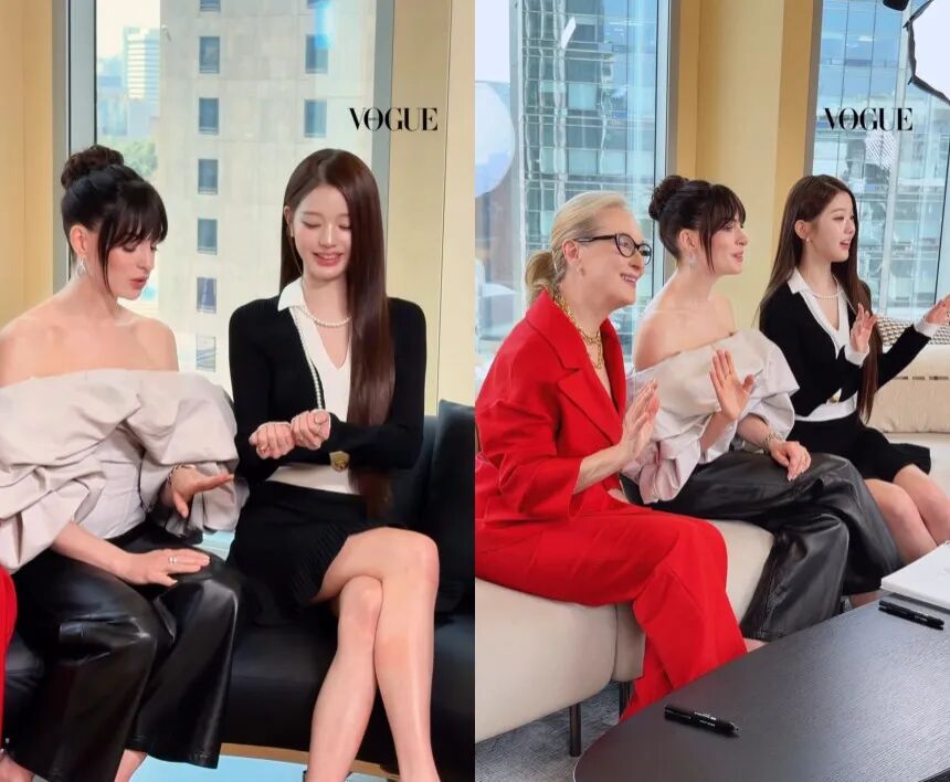 这种反差在电影的宣传策略上显得尤为讽刺。为了开拓亚洲市场,剧组此前可是下足了功夫。在韩国宣传时,片方特意请来了被称为“人间芭比”的顶级爱豆张元英,让她和海瑟薇、斯特里普同台。