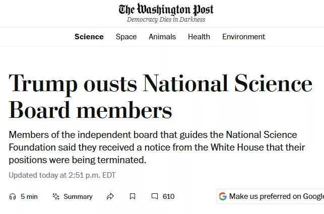 据华盛顿邮报报道,指导美国国家科学基金会(NSF)的独立委员会,美国国家科学委员会(NSB)成员,周五收到了川普政府的解职通知。