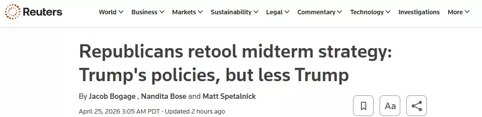 路透报道,在美国汽油价格上涨 、 川普支持率下滑 、 伊朗战争久拖不决的背景下,共和党人正在重新调整 11 月中期选举前的竞选蓝图 。
