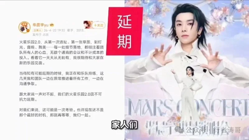 平地惊雷,华晨宇计划于五一期间举办的4场演唱会突然宣布延期。