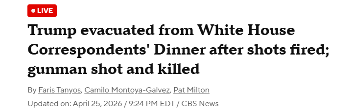 周六晚,在华盛顿希尔顿酒店宴会厅外突发枪击,川普总统从白宫记者晚宴现场撤离。
