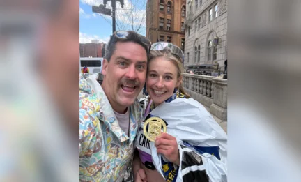 罗布·利亚(左)和卡罗琳娜·格莱希(右)在格莱希跑完波士顿马拉松后合影。