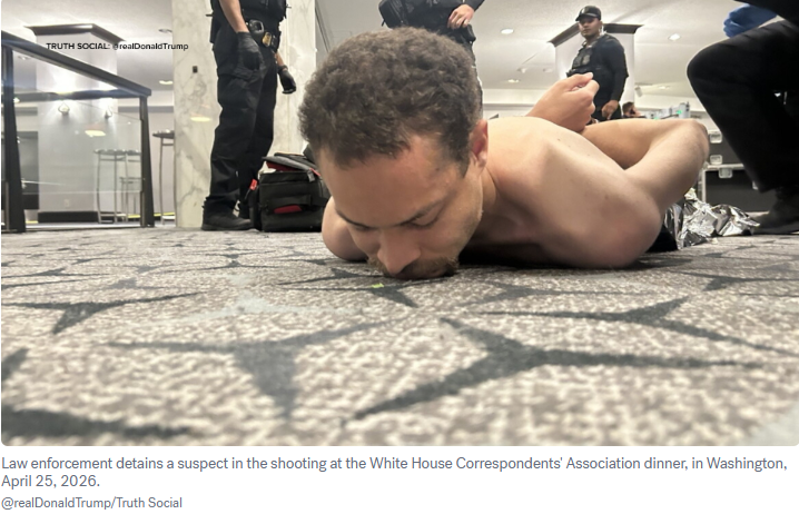 在Truth Social另一贴文中,川普分享了嫌疑人俯卧在地被捕的照片。执法部门正在继续进行调查。川普确认嫌疑人是加州居民。