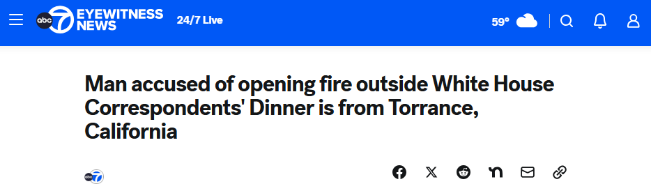 据4月25日报道,涉嫌周六夜间在白宫记者协会晚宴外开枪并冲过安全检查点的男子来自南加州。