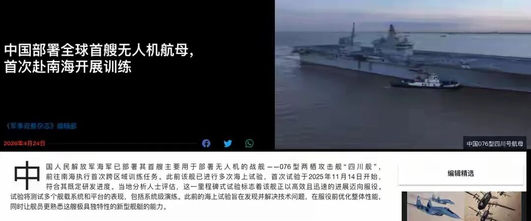 美国时间2026年4月24日(相当于北京时间的昨天),美国军事媒体《Military Watch Magazine》发文《中国部署全球首艘无人机航母,首次赴南海开展训练》。这是美国媒体说的“全球首艘”,也就是说“全球唯一”了,代差式超越美国。