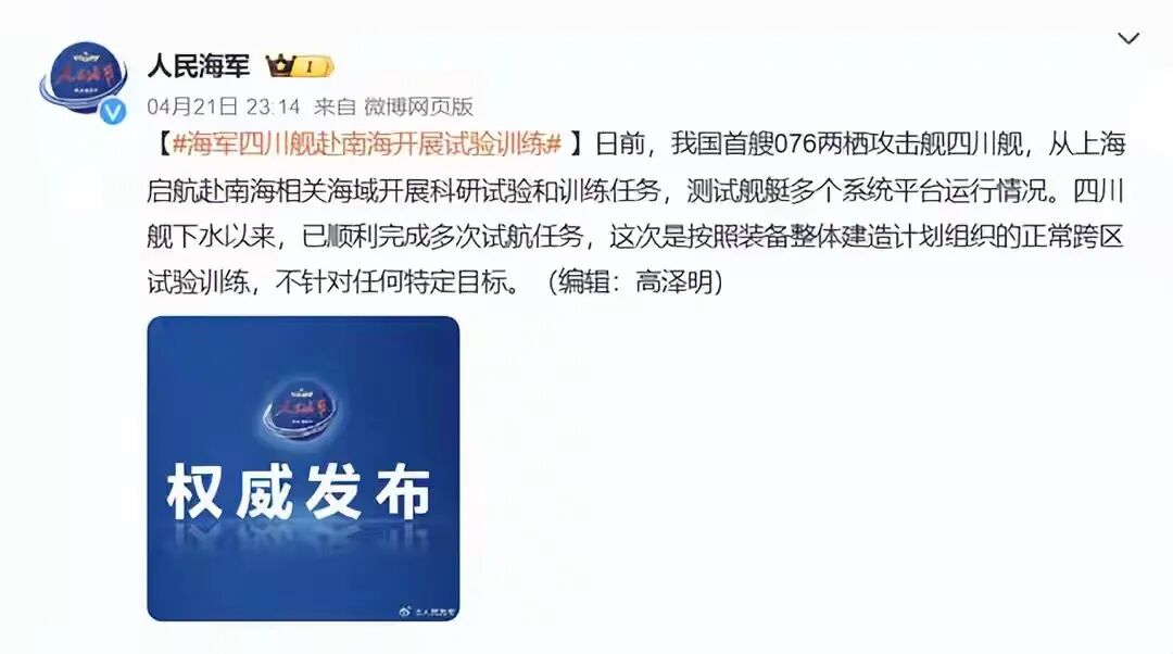 我们先来看看官方账号“人民海军”的报道吧,说“我国首艘076两栖攻击舰四川舰……南海……不针对任何特定目标”。