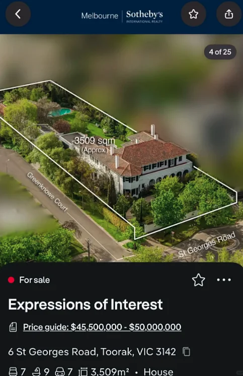 Toorak 是什么地方?这里是墨尔本公认的顶级富人区,随便一套房子都要大几百万澳元起步,而周杰伦这次买的这套,直接喊价4550万到5000万澳元,妥妥的 “顶流中的顶流”!