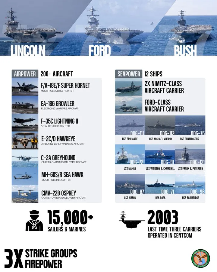 三个航母打击群配齐了200架飞机、9艘阿利伯克级导弹驱逐舰,还有15000名海军和海军陆战队官兵,阵容看着相当豪华。