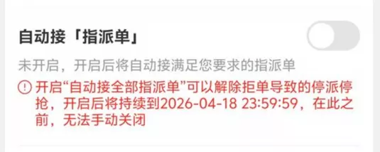 以下是别人的截图(只要开了“自动接单”,无条件接受订单,就能重新上线,例如它派你一个10公里远的4元的订单,你也得干。)。