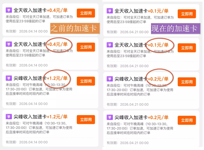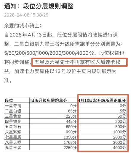 不仅单价变低了。平台还不要脸的搞“升级”,12月底的时候,就搞过一次了,当时就令“8星”降成了“6星”,并且原本的6张加速卡减数量到4张,现在,就更离谱了,宣传时说“不断提高分数,并且取消加速卡”。即:假如你想维持“优先看单,优先派单特权”,你得毫无底线的多接订单,无论单价有多低,你都得接单,否则,平台会扣你分,不让你升级。