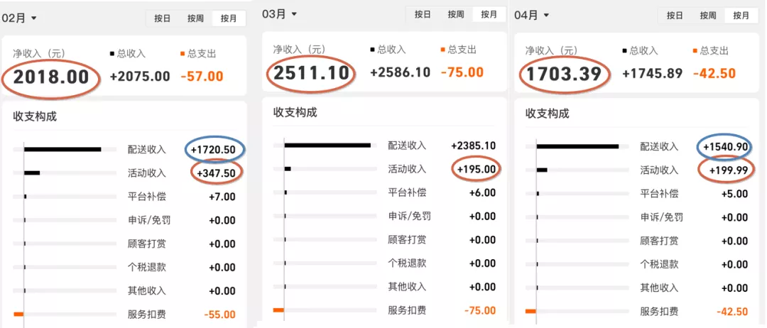 以我的数据来看:淘宝平台到昨天4月完成272单,比2月的268多4单,但基础配送费为1541元,比2月的1720元低了13%。单价变低,并不代表着跑的距离变短,反而是更长了。以前是每天跑5-6小时,最近我经常跑6小时上,才能勉强维持周六日的100元,周一到周五是比以前要花费更长的时间才能够达到80元左右,100元是很难见的了。除非我中午不休息(不充电)。现在加速卡没有了,接下来会少200元一个月。它们的意图很明显,就是如果你想要“拿回这200元,你就得增加工作时长,不断地接更多的低价垃圾单”。