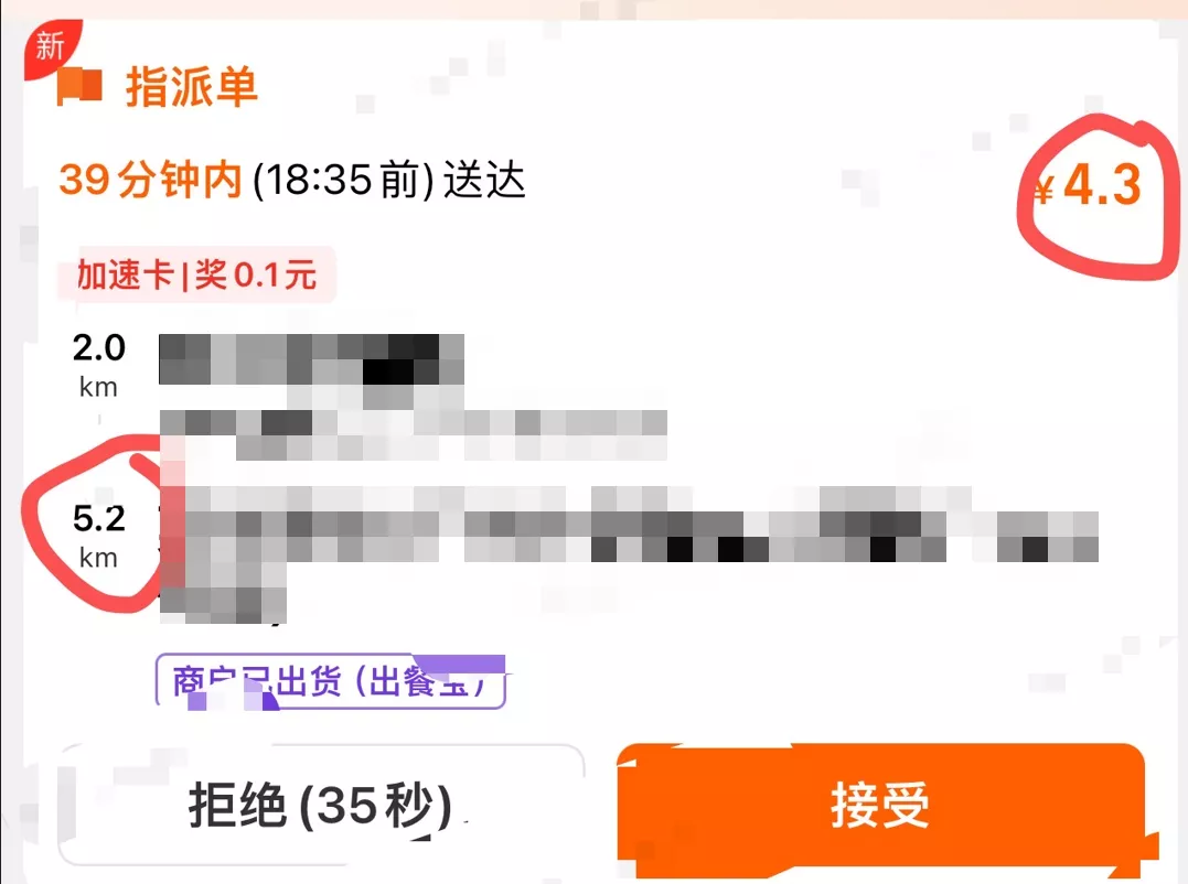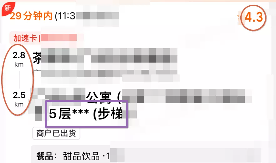 再看这种,取餐3公里,送餐3公里,再爬5楼,4.3元起步价完全没有变化,自从我上过N次当之后,见到这个地址,我都怕了,这地址的5楼有别人7楼那么高……爬完都腿软。最近还见到一个9楼的,我以为有电梯的,结果是步梯,那顾客还不要脸的叫我一直往上爬,爬4楼上到平台,还需要过门禁继续往上爬,最终我是停在了6楼的位置等他下来。真的很扯蛋,半年之前,平台就公告说,它会给予“爬楼梯,过河过桥,徒步小区”等的情况补贴,结果半年过去了,毛都没改变,不仅没增加补贴,还降单价,不仅降单价,还取消“加速卡”,等于是降二次价。